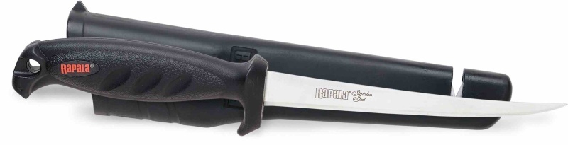 Filetovací nůž s úzkou čepelí a s neklouzavou střenkou pro spolehlivý úchop nabízí komfort při filetování. Výrazný plastový výstupek na střence chrání prst před zraněním. Střenka je vyrobena z vysokopevnostního polymeru a proti skluzu je opatřena vroubkováním povrchu. Čepel je vyrobena z kvalitní nerezové oceli a ostří je ručně broušeno. S nožem je dodávána plastová tvarovaná pochva se zabudovaným brouskem.