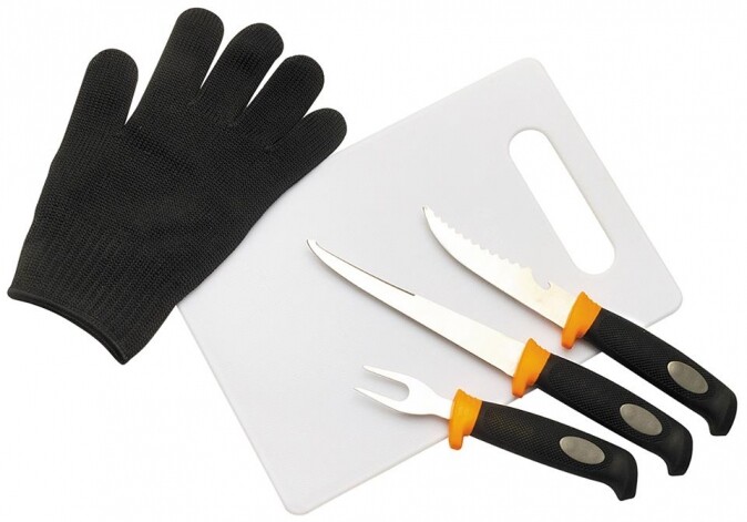 Filetovací sada jejímž obsahem je: 2x filetovací nůž z kvalitní nerez oceli se střenkami z ABS materiálu, vidlička, 1x plastové prkénko, 1x rukavice odolná proti proříznutí