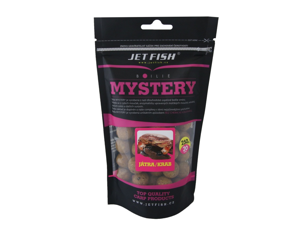 Boilie Mystery - 250g (20mm) Nová účinnější receptura! Tuto zcela novou recepturu boilie Mystery jsem začal připravovat někdy před dvěma lety. Chtěl jsem sestavit okamžitě účinné boilie, které by chytalo kapry ihned po vhození do vody bez jakéhokoliv předkrmení. Musím říci, že se mi to povedlo a po mnoha úspěšných testech přináším zcela novou recepturu a čtyři nejúčinnější příchutě: oliheň/chobotnice, játra/krab, pomeranč/ananas a frankfurtská klobása/koření. Boilie je sestaveno na bázi rozpustných rybích produktů a extrudovaných ptačích zobů, podobně jako Seafood, a proto je také tak účinné. Povedlo se mi i nadále zachovat příznivou cenu, i když toto boilie je kvalitativně podstatně výše. Zbrusu nové máme i balení v kbelících 3 kg/2,70 kg (dle průměru). Kbelíky jsou potištěné a po spotřebování boilie je mohou rybáři dále používat například na krmení. Boilie Mystery je určené na rychlé chytání, protože se ve vodě postupně omílá a tím láká kapry ke krmení. Ty díky omílání boilie a uvolňování drobných částeček do okolí propadají tzv. žracímu šílenství. Boilie Mystery je vhodné i pro závodní rybolov, díky své rychlé účinnosti a je boiliem budoucnosti pro váš úspěšný lov! Bez chemické konzervace