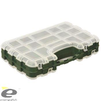 Velmi známý box na pomůcky s dvojitým ,,sendvičovým" víkem. Díky vytvarování spolkne všechny sezonní pomůcky. Jedna strana je rozdělená na stejné přihrádky, proto se do ní krásně umístí bižuterie, olůvka, krmítka atd. Na druhé straně jsou umístěné dlouhé příčky, v kterých je možné uchovávat splávky a jiné rozměrné pomůcky. Díky průsvitnému víku vidíme obsah bez nutnosti otevření krabice. Na víku se nacház pevný uzávěr, který při uzavření garantuje nepromíchání uložených pomůcek. Dobře přizpůsobený na uchování a přenášení nářadí, šrobků a jiných základních potřeb. Obsah: Na 1 straně: přihrádky - 2 kusy 6x6x3 cm, 2 kusy 6x5x3,3 cm, 2 kusy 7,5x6x3,3 cm, 2 kusy 5x6x3,3 cm, 2 kusy 5x5x3,5 cm, 2 kusy 5x8x3,3 cm, 1 kus 8x6x3,3 cm, 1 kus 8x5x3,3 cm a 1 kus 8x4x3,3 cm, ale na druhé straně: 2 kusy 8,5x6x3,3 cm, 2 kusy 5x19x3,5 cm a 1 kus 8,5x15x3,3 cm. Technické údaje: Hmotnost: 490g Rozměry: 33x21x7,5cm