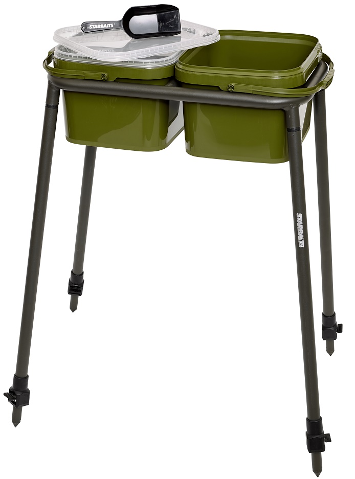 Stojan na kbelíky pro kobrování nebo krmení raketou ocení všichni ti, které už nebaví se neustále ohýbat ke kyblíku na zemi. Pevný lehký kovový rám a 4 nastavitelné teleskopické nohy. Pro transport se nohy odšroubují. Součástí balení jsou i dva 8 l kbelíky s víkem a vnadící lopatkou. Nastavitelná výška 75-130 cm, váha 2,2 kg, transportní rozměry 75x33 cm.