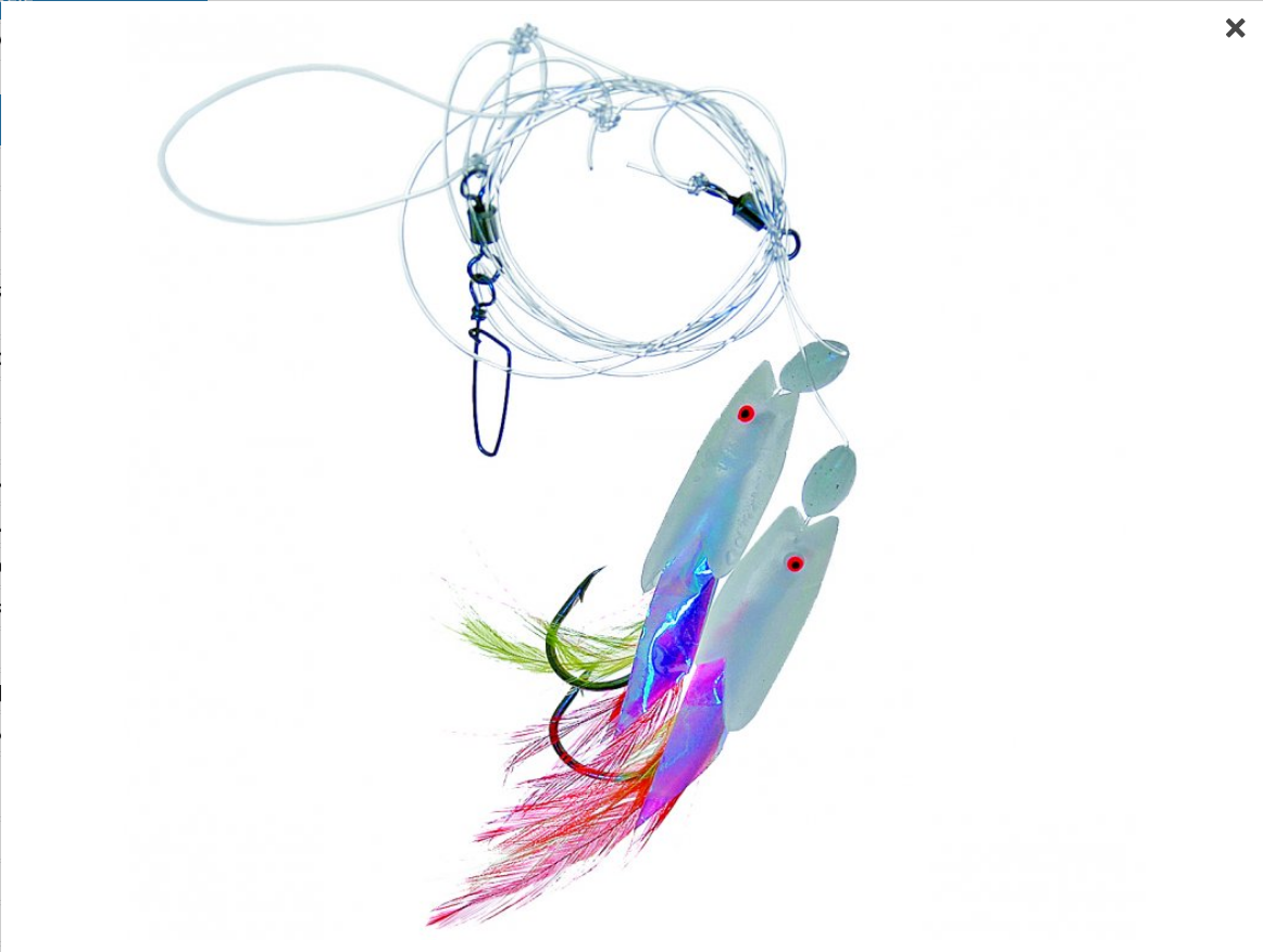 Návazec obsahuje velké fosforeskující korále, pevný obratlík a karabinu k rychlé výměně spodního závaží, nebo pilkeru.
