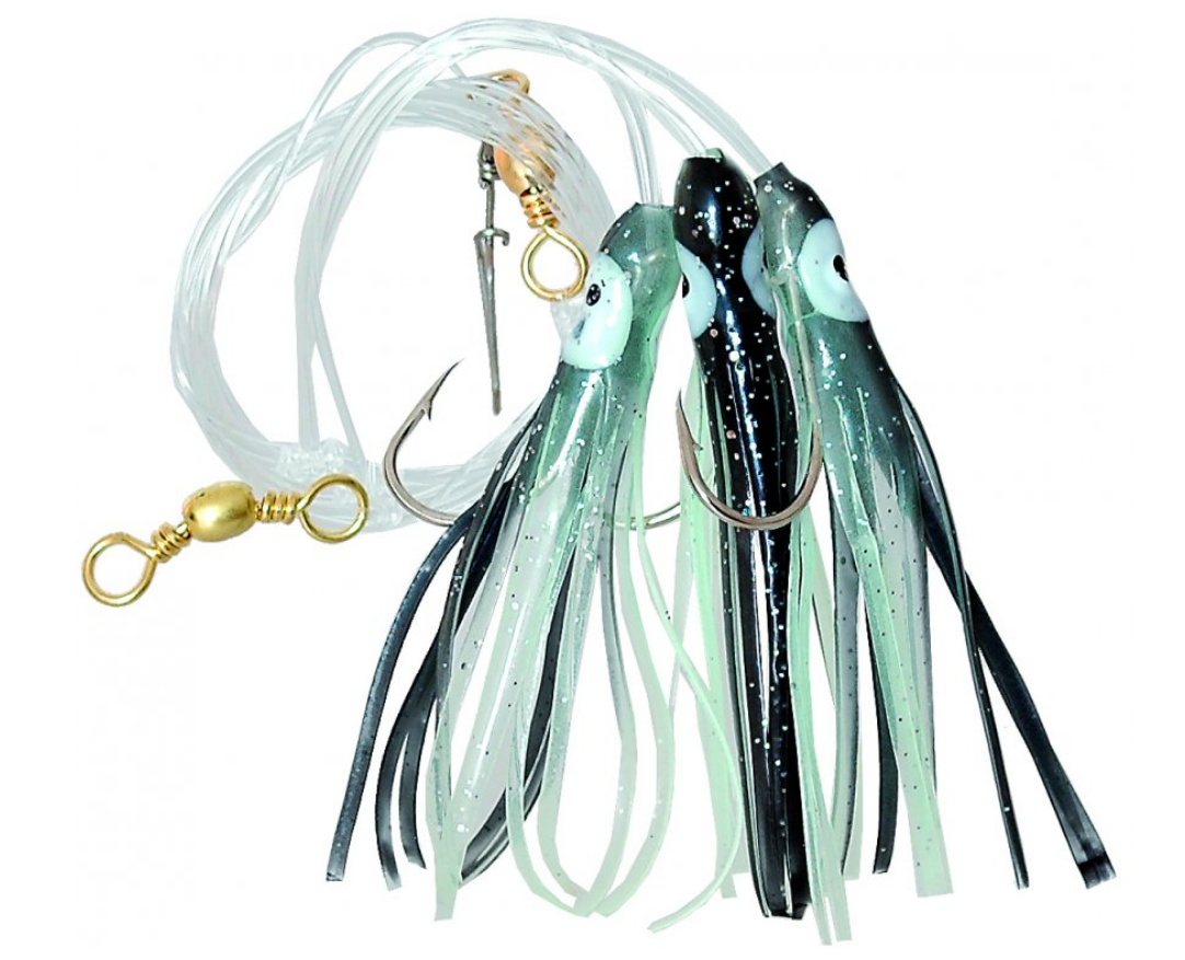 Návazec obsahuje fluo chobotničky, pevný obratlík a karabinu k rychlé výměně spodního závaží, nebo pilkeru.