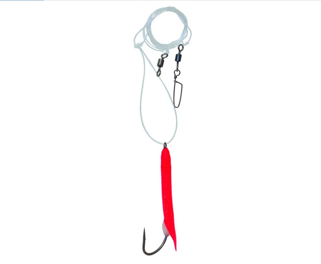 Návazec obsahuje velké fosforeskující korále, pevný obratlík a karabinu k rychlé výměně spodního závaží, nebo pilkeru.