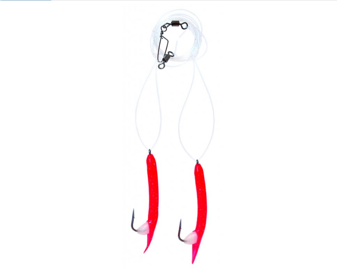 Návazec obsahuje velké fosforeskující korále, pevný obratlík a karabinu k rychlé výměně spodního závaží, nebo pilkeru.