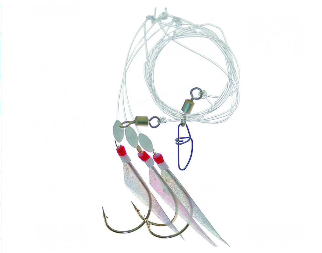Návazec obsahuje velké fosforeskující korále, pevný obratlík a karabinu k rychlé výměně spodního závaží, nebo pilkeru.