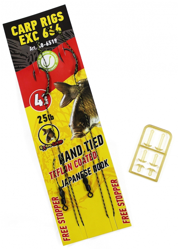Hotové boilies návazce s obratlíkem, kroužkem a s matným kroužkem na vlasu pro snadnější zaseknutí ryby. Prvotřídní návazce jsou zhotoveny z extra ostrých japonských, teflonových háčků bez protihrotu a kamuflážní šňůrky splétané z osmi vláken, což jim dodává velkou nosnost a odolnost vůči oděru.