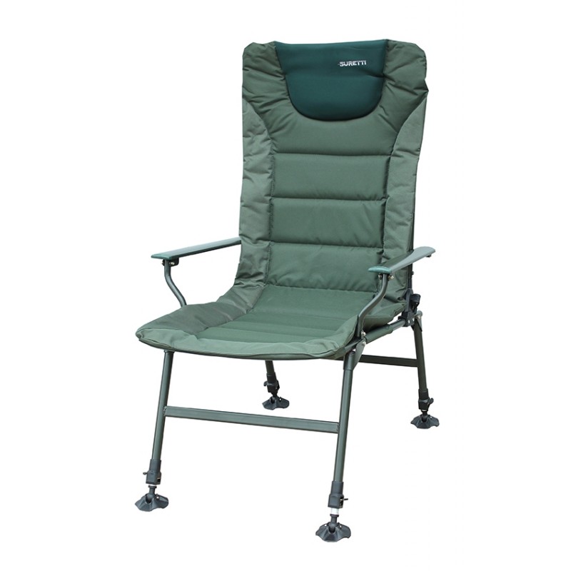 Rybářské křeslo se zvýšeným opěradlem, novou pevnější konstrukcí podpěrek, novou aretací nohou proti jejich sklopení a novým excentrickým zámkem nastavení výšky. Konstrukce je z ocelových trubek o průměru 22mm, nohy jsou zesílené, vyrobené z materiálu o průměru 25mm. Celá konstrukce je pak nakomaxitována zelenou barvou. Polstrovaná matrace je z odolného materiálu 600D Oxford, kde sedací část, bederní a opěrka hlavy mají dodatečné polstrování pro pohodlné sezení. Sedák má rozměry 50x53cm a opěradlo 50x75cm. Výška se dá nastavit v rozmezí 33 až 43cm. Křesílko má díky zesílené konstrukci nosnost 150kg.