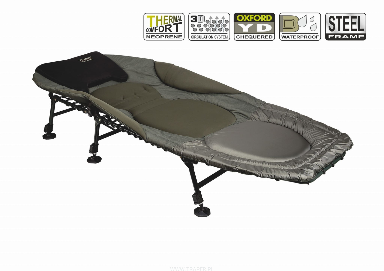 Klasické lehátko 6 nohou z nejkvalitnějšího materiálu Oxford 600D v kombinaci s neoprenovými opěrkami hlavy. Střední část je pokryta pružným neoprenem. Ve výšce nohou v posteli je silný, omyvatelný zátěr. Postel je nastavitelné v úhlu sklonu a výšce nohou.