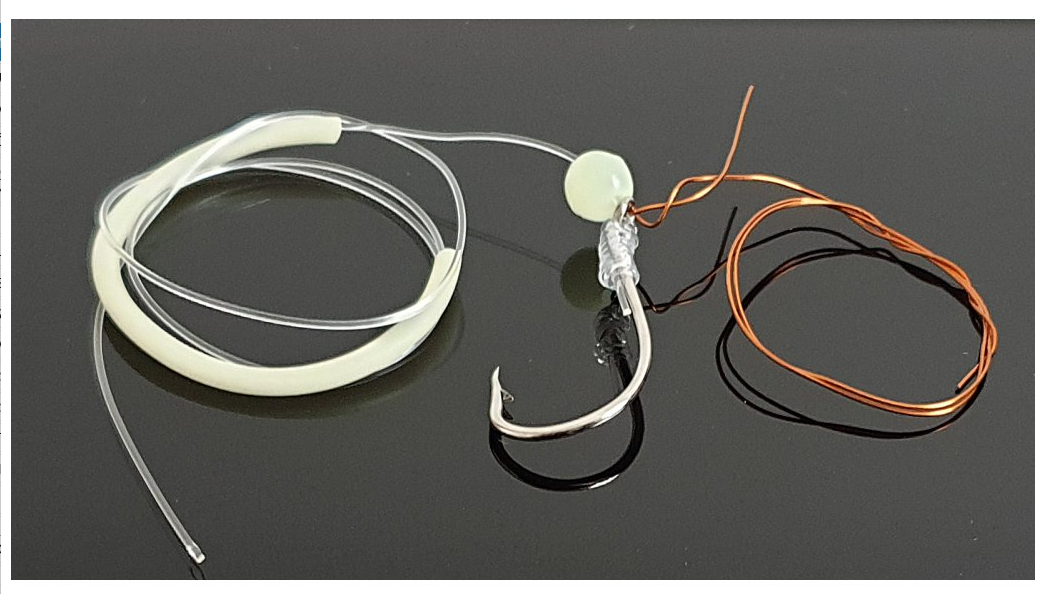 Návazec obsahuje velký a pevný háček, fluorescentní hadičku a korálek. Měkký mosazný drát na přitažení nástrahy.