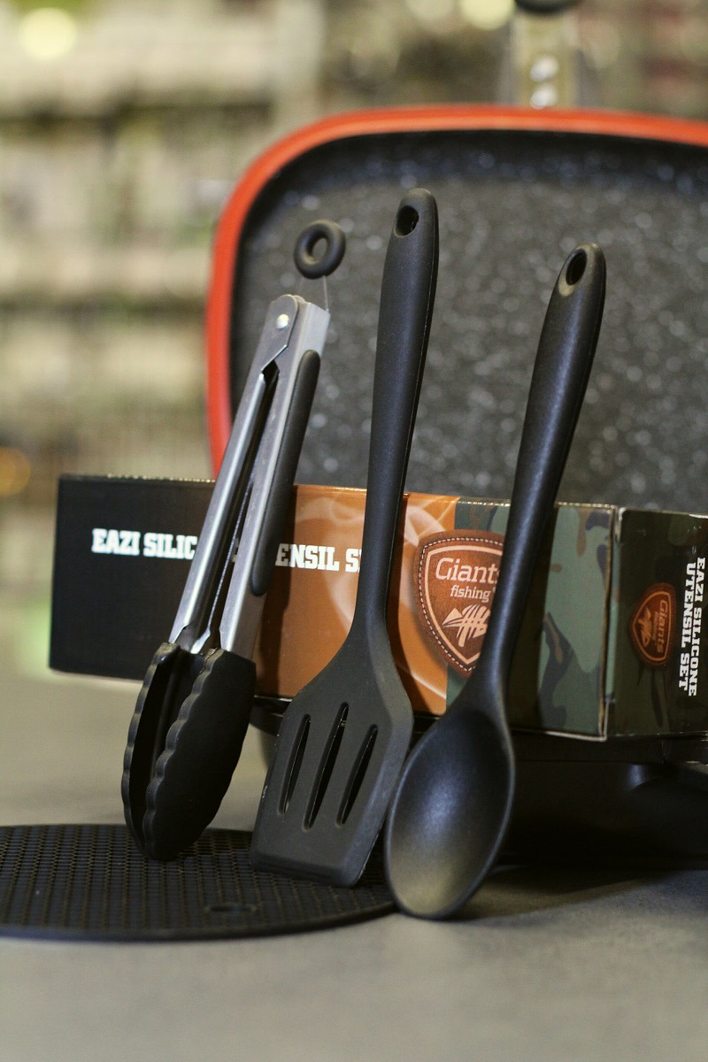 Součástí sady je odkládací podložka, grilovací kleště, obracečka a lžíce.