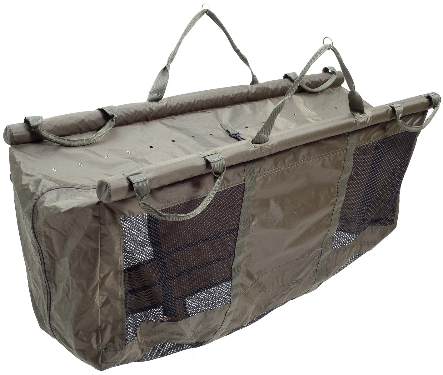 Velký vážící a přechovávací vak. Díky dvěma velkým plovákům a extra široké konstrukci v něm lze bez problémů ponechat i velkého kapra. Horní část je zajištěná zipem, pojistka na klip. Mikrotkanina zabraňuje poškození ryby. Rybu pak lze ve vaku i zvážit díky pevné tyčové konstrukci. Madla pro snadnou manipulaci a přenos. Rozměry: 122 x 62 x 40 cm. Váha: 1,02 kg.