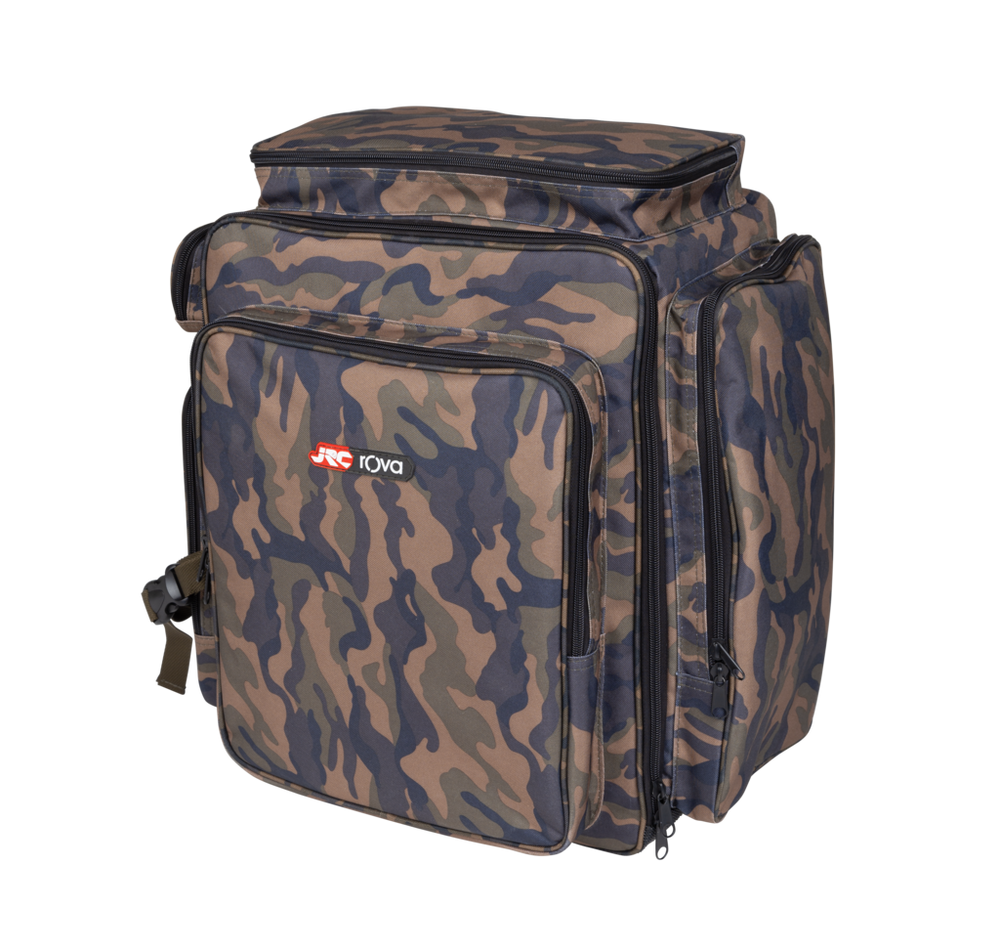 Odolná a voděodolná polyesterová konstrukce 500D Rova Camo Polstrovaná záda a nastavitelné ramenní popruhy Pět vnějších kapes navržených se snadno přístupnými zipy Vybaveno dvěma vnějšími sponami pro připevnění podběráku nebo záchranného popruhu Prostorná hlavní komora se dvěma síťovanými kapsami uvnitř Jedna rukojeť navíc Zesílená voděodolná základna Rozměry: 50 x 44 x 30 cm