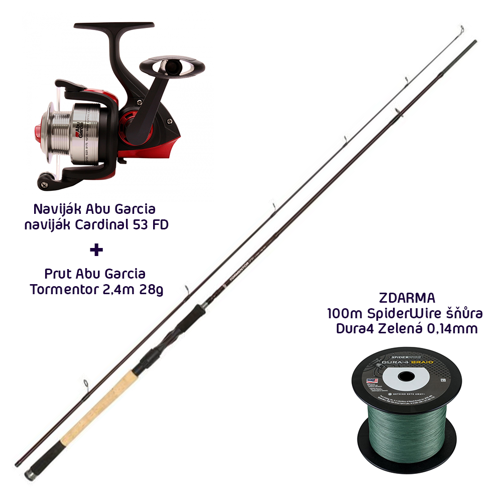Set obsahuje: Abu Garcia naviják Cardinal 53 FDAbu Garcia prut Tormentor 2,4m 28g100m SpiderWire šňůra Dura4 Zelená 0,14mm