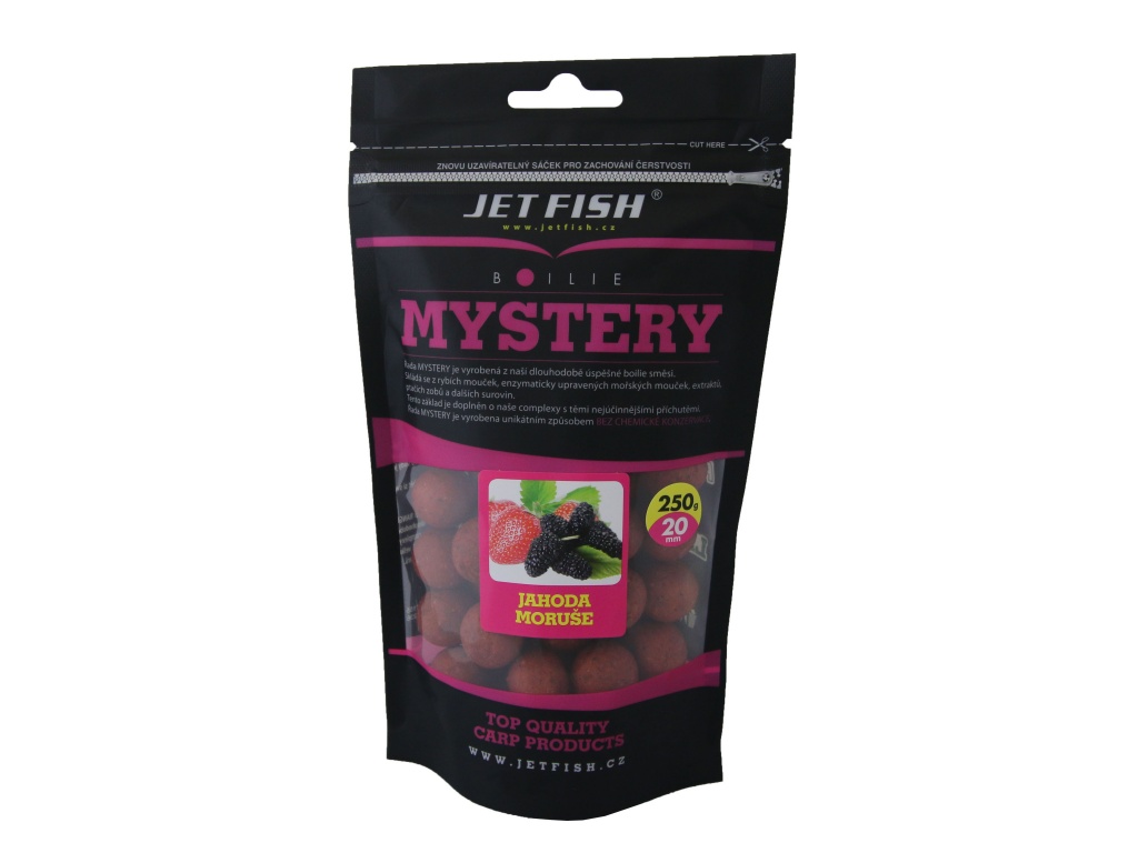 Při sestavování této řady boilie šlo především o vytvoření nejrychleji fungující nástrahy na krátkodobý i střednědobý rybolov. Boilie je sestavené na bázi těch nejkvalitnějších rybích mouček, rozpustných rybích produktů, mořských extraktů a extrudovaných ptačích zobů, podobně jako Seafood, a proto je také tak účinné. Další výhodou této řady je, že se každé boilie skládá ze dvou příchutí. Jak jsme zjistili při testování, pro rychlé chytání je to účinnější než klasické příchutě, a hlavně se tím odlišíte od všech ostatních. Povedlo se i nadále zachovat příznivou cenu, i když toto boilie je kvalitativně podstatně výše nejen kvůli zcela nové receptuře. Nové je rovněž i balení v kbelících 3 kg/2,7kg (dle průměru). Kbelíky jsou potištěné a po spotřebování boilie je můžete dále používat například na krmení. Boilie Mystery je určené na rychlé chytání, protože se ve vodě postupně omílá, a tím láká kapry ke krmení. Ty díky omílání boilie a uvolňování drobných částeček do okolí propadají tzv. žracímu šílenství. Boilie Mystery je vhodné, díky své rychlé účinnosti, i pro závodní rybolov a je boiliem budoucnosti pro váš úspěšný lov! Bez chemické konzervace.