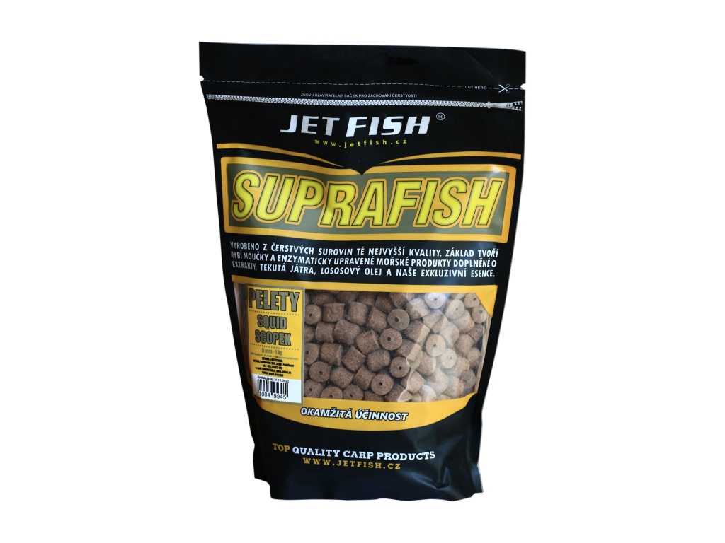 Další novinkou řady Suprafish jsou 8mm pelety s dírou. Tyto pelety jsou vyrobeny speciální technologií a obsahují mix účinných složek, tekutých potrav a neokoukaných esencí. Pelety jsou ve stejných příchutích jako boilie a skvěle ho při chytání doplňují. Díky tomu, že jsou s dírkou, dají se použít i jako samostatná nástraha. Nejlépe však fungují v kombinaci s boiliem anebo třeba s partikly, doplnňné některou příchutí boosteru řady Suprafish. Vysoce zvýší účinnost boilie a počet záběrů. Ideální pro celoroční použití.