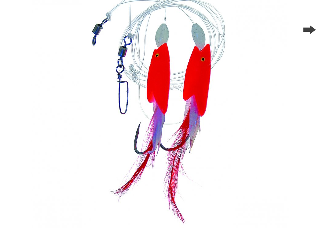 Návazec obsahuje velké fosforeskující korále, pevný obratlík a karabinu k rychlé výměně spodního závaží, nebo pilkeru.