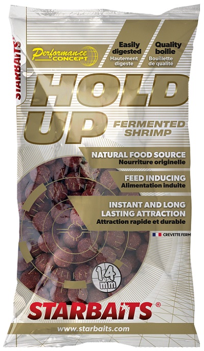 HOLD UP je směsí frementovaného (kvašeného) krevetového masa v kombinaci s živočišnými složkami s extrémně silnou pachovou stopou. Po dopadu do vody boilies okamžitě uvolňuje atraktační látky a rychle láká zejména velké kapry i z velké vzdálenosti. Fermentované ingredience navíc výrazně urychlují stravitelnost boilies (ryba se nepřesytí), a proto Hold Up doporučujeme také na masivní krmení.
