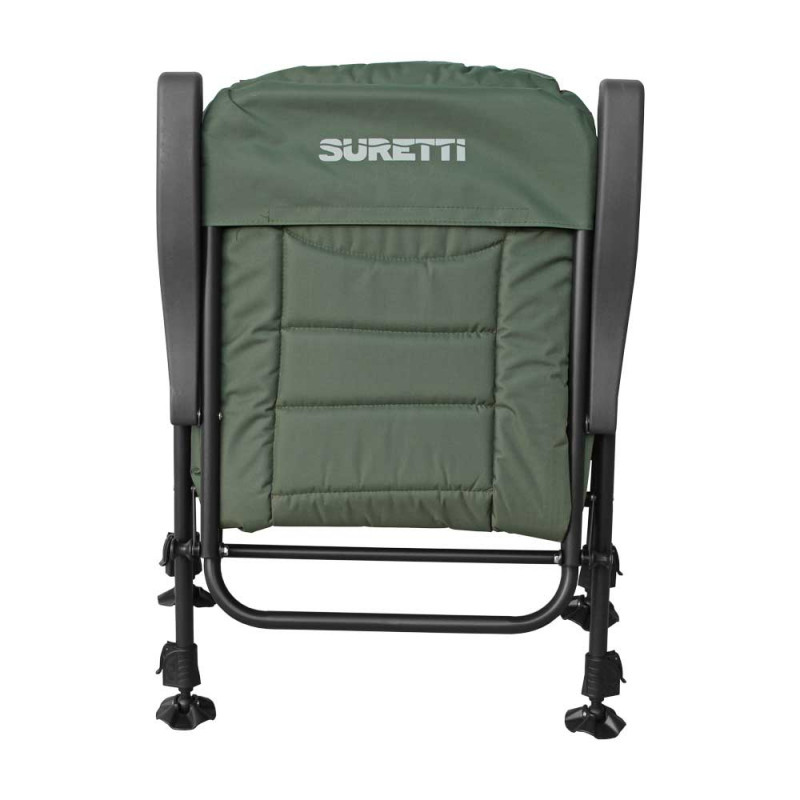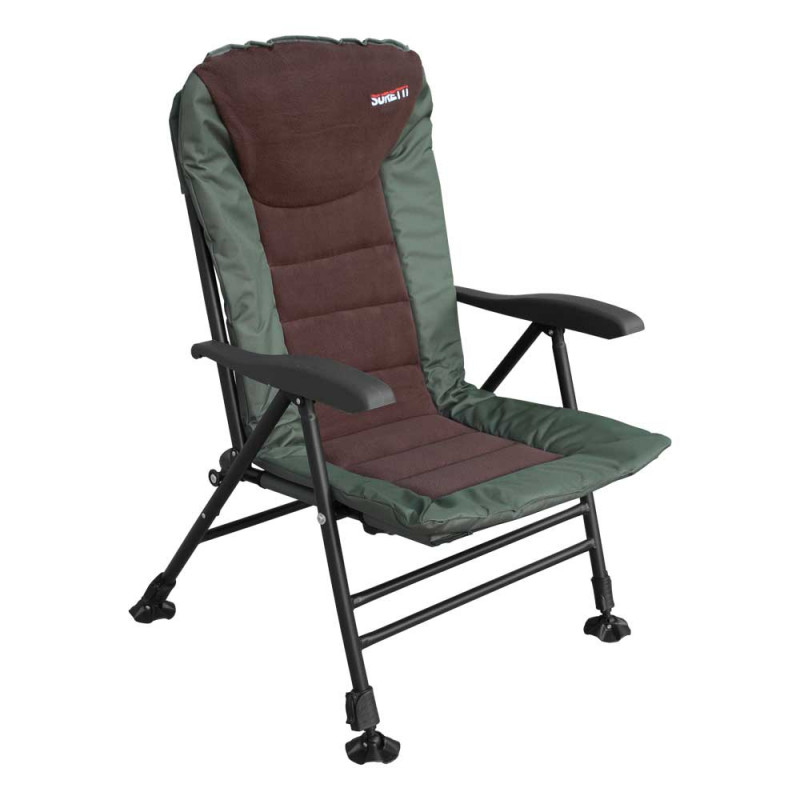 Pohodlné a exkluzivní rybářské křeslo s anatomicky tvarovanou matrací. Konstrukce křesla je ocelová o tloušťce stěny 2mm a velmi jednoduchá, pevná s nosností až 160kg, jeho rozložení či složení je otázkou několika vteřin. Opěradlo má pohodlný polštář a na bocích matrace je lem, chránící před větrem a zimou. Pevné područky slouží k naklápění opěradla při jejich nadzdvižení (8 poloh). Teleskopické nohy jsou vybaveny spolehlivou aretací a protiskluzovými packami proti zaboření. Výška sedáku 37 - 56 cm bude pro mnohé velkou výhodou, při častém vstávání k prutům.