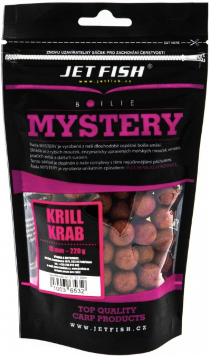 Tuto zcela novou recepturu boilie Mystery jsem začal připravovat někdy před dvěma lety. Chtěl jsem sestavit okamžitě účinné boilie, které by chytalo kapry ihned po vhození do vody bez jakéhokoliv předkrmení. Musím říci, že se mi to povedlo a po mnoha úspěšných testech přináším zcela novou recepturu a čtyři nejúčinnější příchutě: oliheň/chobotnice, játra/krab, pomeranč/ananas a frankfurtská klobása/koření.