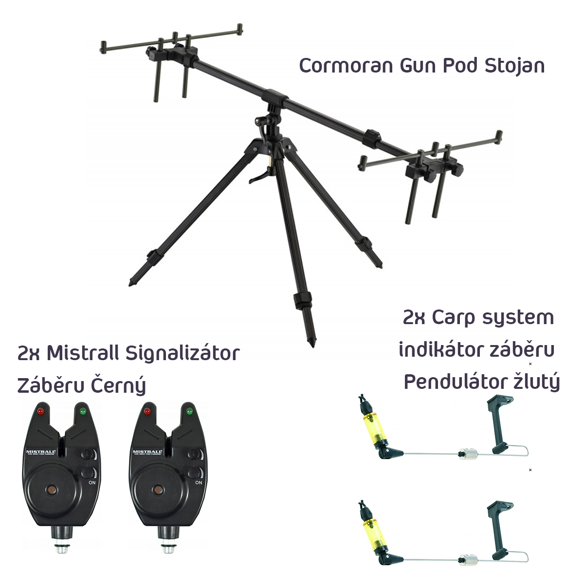 Kaprařský stojan Cormoran Gun Pod model 81002 osazený 2ks signalizátorů a 2ks swingerů.