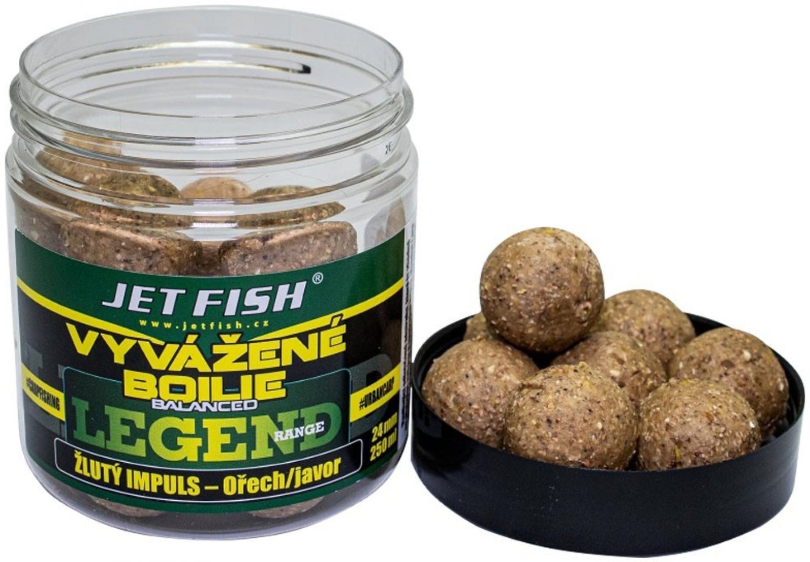 Jet Fish vyvážené boilie Legend range 250ml 24mm Žlutý impuls Ořech/javor