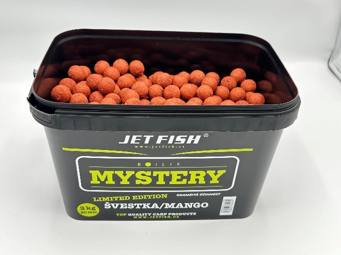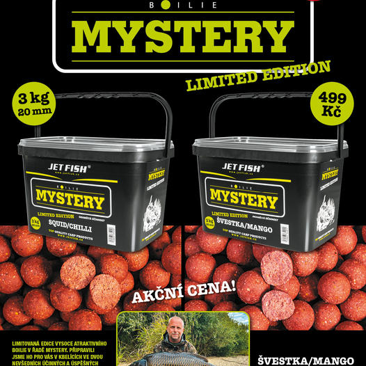Při sestavování této řady boilie šlo především o vytvoření nejrychleji fungující nástrahy na krátkodobý i střednědobý rybolov. Boilie je sestavené na bázi těch nejkvalitnějších rybích mouček, rozpustných rybích produktů, mořských extraktů a extrudovaných ptačích zobů, podobně jako Seafood, a proto je také tak účinné. Další výhodou této řady je, že se každé boilie skládá ze dvou příchutí. Jak jsme zjistili při testování, pro rychlé chytání je to účinnější než klasické příchutě, a hlavně se tím odlišíte od všech ostatních. Povedlo se i nadále zachovat příznivou cenu, i když toto boilie je kvalitativně podstatně výše nejen kvůli zcela nové receptuře. Nové je rovněž i balení v kbelících 3 kg/2,7kg (dle průměru). Kbelíky jsou potištěné a po spotřebování boilie je můžete dále používat například na krmení. Boilie Mystery je určené na rychlé chytání, protože se ve vodě postupně omílá, a tím láká kapry ke krmení. Ty díky omílání boilie a uvolňování drobných částeček do okolí propadají tzv. žracímu šílenství. Boilie Mystery je vhodné, díky své rychlé účinnosti, i pro závodní rybolov a je boiliem budoucnosti pro váš úspěšný lov! Bez chemické konzervace.