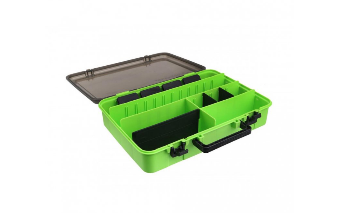 Kvalitní a pevná plastová krabička s šedým průhledným víkem, určená pro uložení a přepravu krmítek a různé další rybářské bižuterie. Uvnitř naleznete několik nastavitelných přihrádek, nechybí ani spolehlivé madlo pro snadné uchopení krabičky.