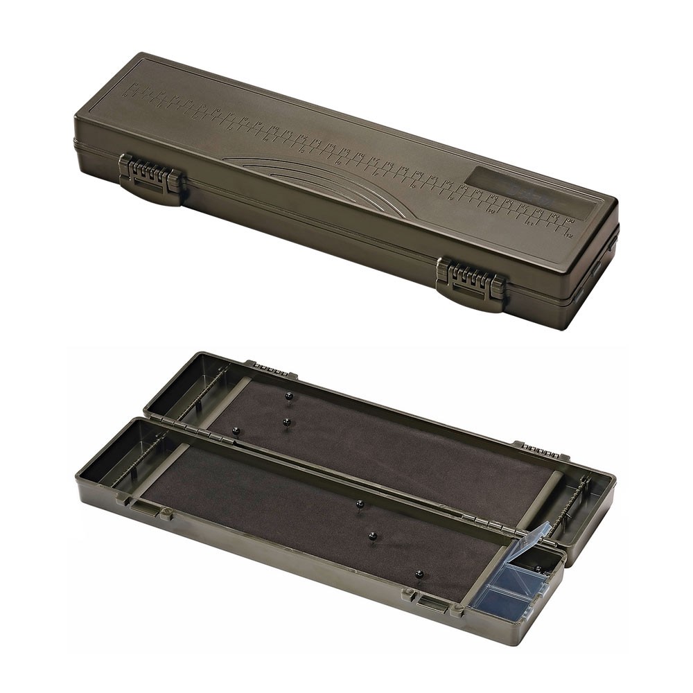 Velmi funkční box na montáž, vyrobený z nárazuvzdorného tmavě zeleného ABS materiálu, který umožňuje pohodlné a praktické uložení montáží. Stačí zavěsit háček na k tomu navrženou tyč a konec montáže upevnit v tvrdé pěně jedním z kolíků. Navíc je vybaven třemi přihrádkami na háčky pro uložení náhradních háčků, zarážek na boilies, kroužků na montáž, návnad atd. Tento box by neměl chybět v dnešní výbavě kaprařů!