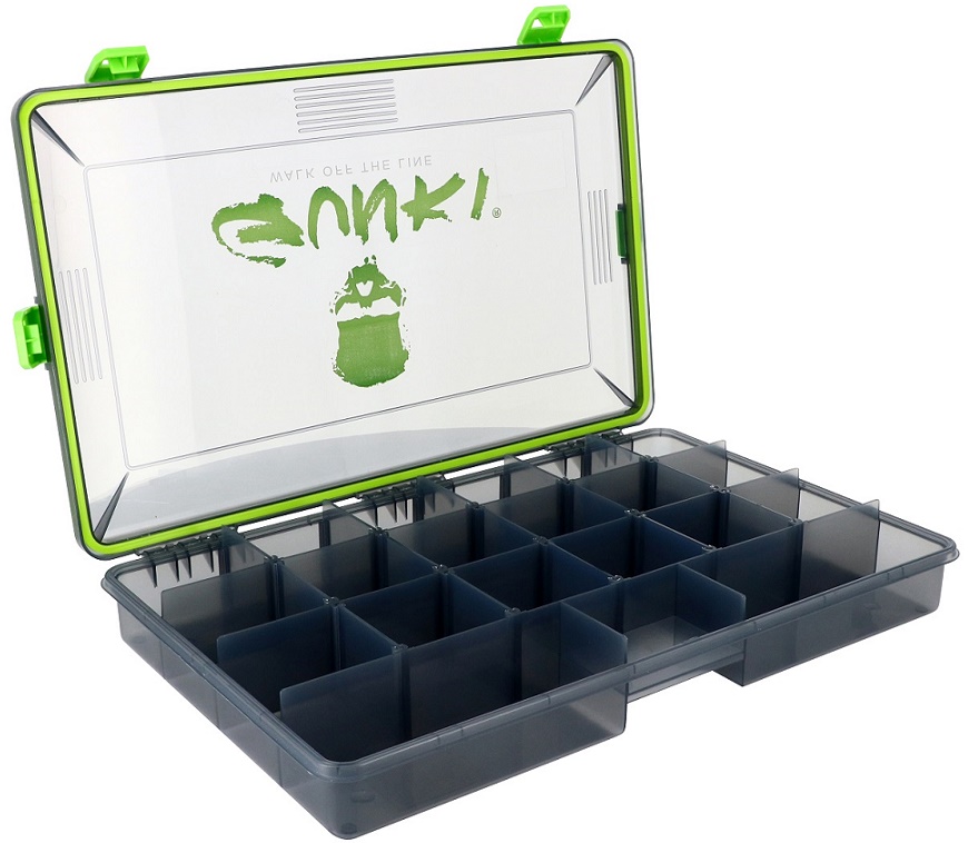 Vodotěsná krabička na nástrahy s nastavitelnými přihrádkami. Vhodná především do lodě nebo na bellyboat. Tmavá barva chrání nástrahy před UV zářením. Rozměr: 35,5x23x5 cm.