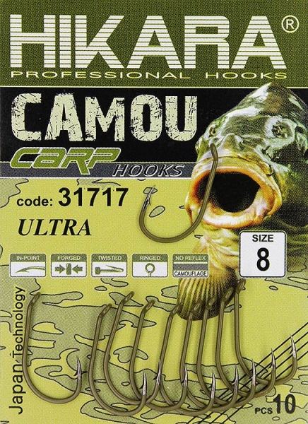 Extra pevný kaprový háček potažený silikonem v Camo barvě.