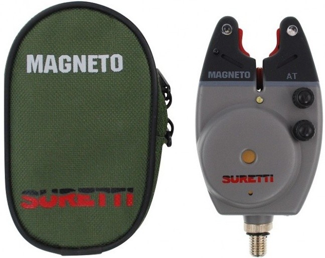 Magneto je signalizátor konvečních rozměrů poháněný klasickou 9V baterií. Standardně je dodáván v ochranném pouzdře ze syntetické kůže. Pro eliminaci veškerých nežádoucích odlesků je jeho povrch zmatován speciální černou uhlíkovou vrstvou. Má automatické noční poziční osvětlení, paměťová a záběrová dioda je samozřejmostí. Samozřejmostí je také regulace hlasitosti (plynule od 0 do 100%), regulace výšky tónu a 2,5mm výstup pro připojení k odposlechu. Základní deska signalizátorů je zalitá ve voděodolné silikonové vrstvě, bezchybně tak pracuje i za těch nejsilnějších dešťů. Signalizátor má bezvadné provedení, klasický design a spolehlivou elektroniku. Plynulá regulace hlasitosti, plynulá regulace výšky tónu, volba mezi klasickým nebo zvířecím zvukem (frog = žába, duck = kachna), automatické variabilní bílé noční přisvětlení, 2,5mm zdířka k připojení příposlechu nebo swingeru, modrá paměťová 20s LED dioda, červená záběrová LED dioda, 100% voděodolný, napájení 9V baterií typu PP3 (není v balení). Rozměry: 60x45x120 mm