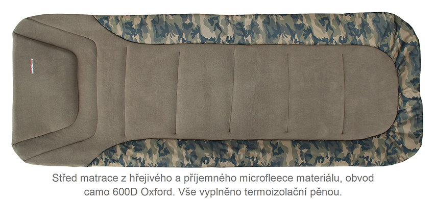 Ploché lehátko Promaster Camo poskytuje velmi vysoký komfort, který budekonkurovat i spaní, které máte doma. Promaster Camo je šestinohé ploché lehátko (bez kloubu) se stabilitou osminohého lehátka. Unikátní rozložení tří páru noh umožňuje sezení po celé délce lehátka. Nohy mají aretaci proti sklopení. Střed matrace je s micro fleece a po obvodě camo 600D Oxford a to celé vyplněno termoizolační pěnou. Matrace s polštářem je na konstrukci v prostřední části vyztužena pro větší pohodlí. V transportní poloze je lehátko fixováno popruhem. 6x nohaOcelová konstrukceAretace nohou - nehrozí zhroucení lehátkaNohy s packou s antismykovou dosedací plochouMatrace je ve střední části vyztužena, pro větší pohodlí.Rozměr matrace 212x80cmTransportní rozměry 82x83x25cmNosnost 150kgVáha 9,5kg