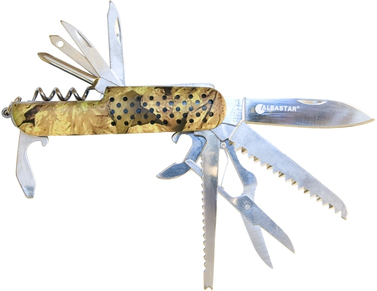 Nůž je zavírací a má camou zbarvení. Jeho výbava obsahuje čepel z nerezové oceli, vrták, nůžky, 2x pilku, otvírák, pilník, vývrtku, křížový šroubovák, atd.